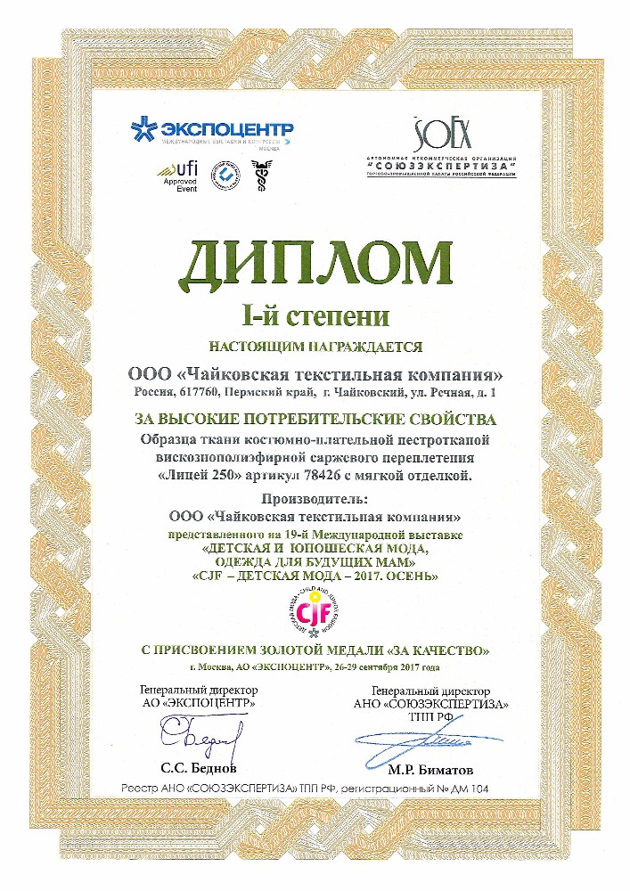 Золотую медаль за качество и высокие потребительские свойства завоевала костюмная ткань для школьной формы «Лицей 250» в конкурсе товаров для детей.