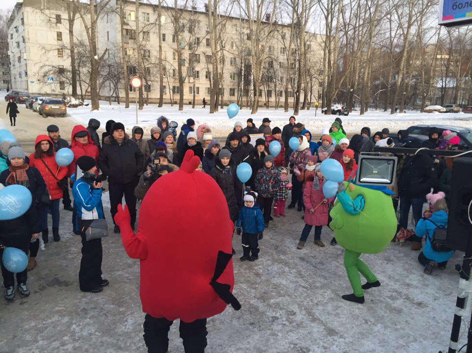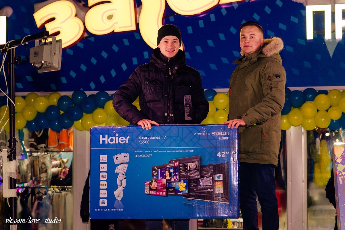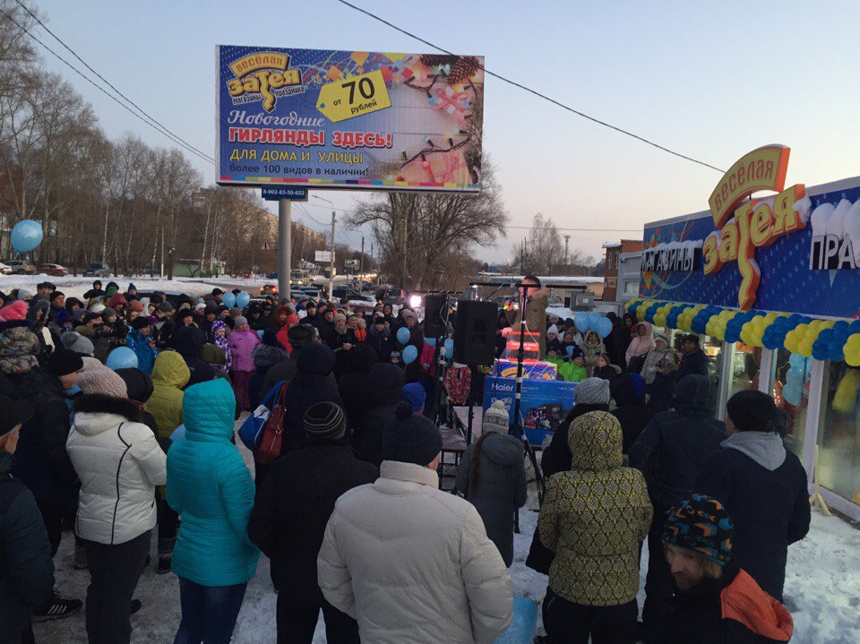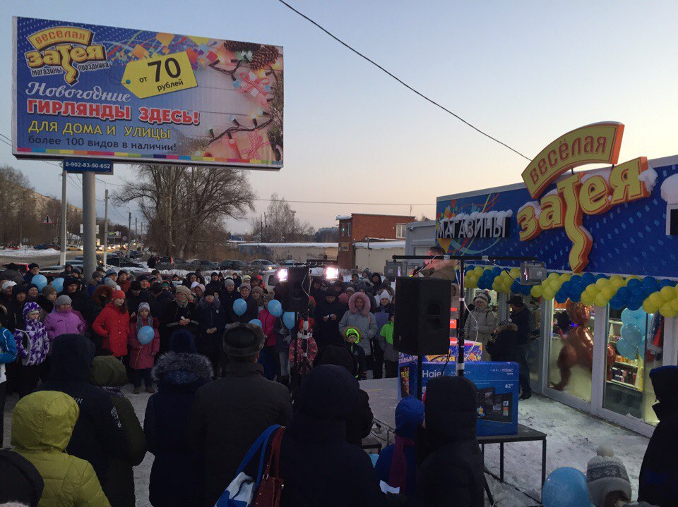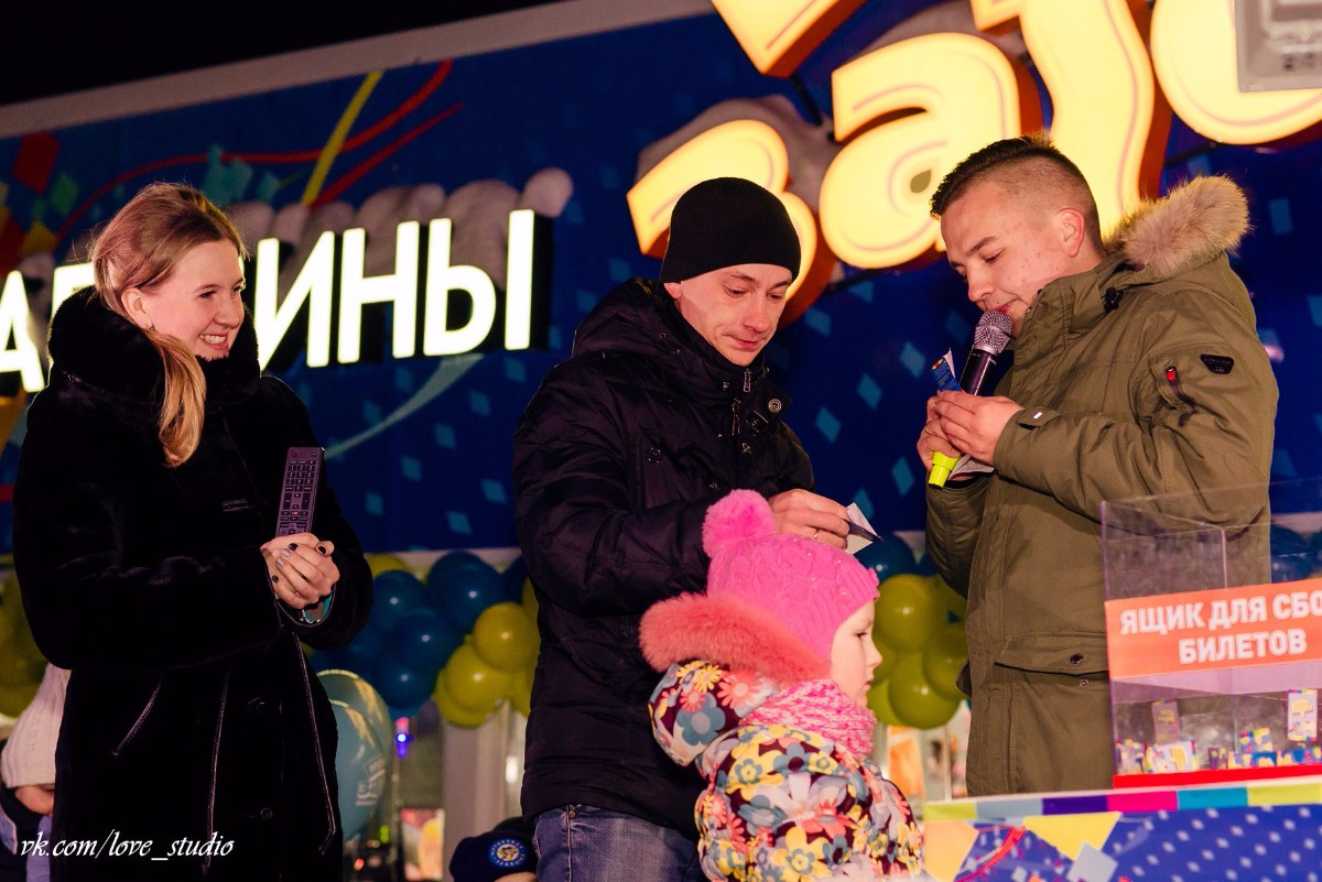 Официальное открытие магазина состоялось 18 ноября, а его торжественная часть позднее, 9 декабря. Несмотря на холод, в этот день у магазина собралось много гостей. Пришли те, кто уже успел совершить в магазине покупки, став участником праздничного розыгрыша призов. Их встретили ростовые куклы, весёлая музыка и ведущий Данил Голубчиков, шутки которого помогали гостям согреваться. Самым волнительным моментом этого мероприятия, конечно же, стал розыгрыш главного приза - телевизора диагональю 109 см.
