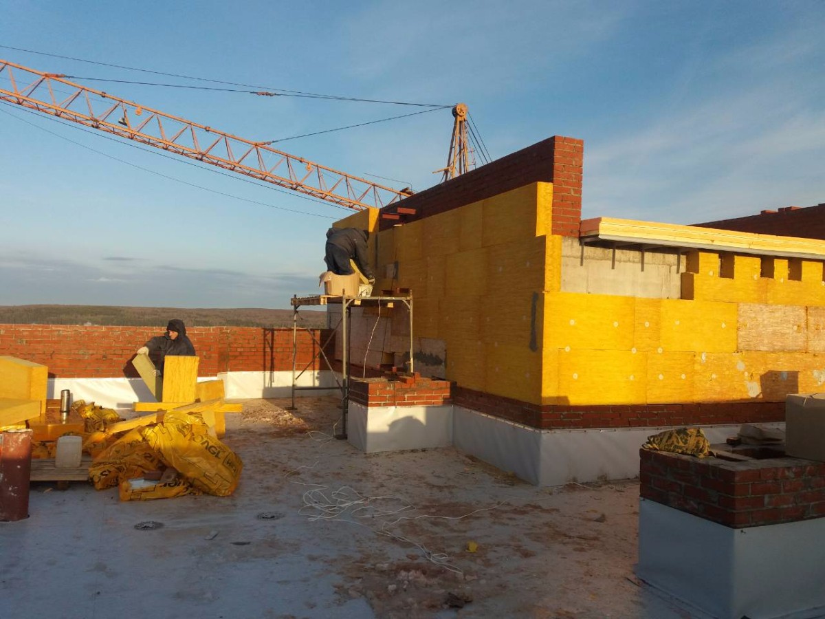 Как пояснил нам исполнительный директор строительной компании Павел Имаев, на доме продолжается устройство кровли, заполнение оконных проёмов, монтаж системы отопления, бетонирование силовой плиты пола цокольного этажа, ливневой и бытовой канализации. Завершается монтаж пазогребневых перегородок и утепление фасада. Полным ходом идут работы по устройству входных групп в цокольный этаж. Кроме того, строители ведут кладку внутренних стен цокольного этажа из газоблоков, так же завершена кладка кирпичных перегородок электрощитовой, ИТП и водомерного узла. Цокольный этаж жилого здания будет предназначен для офисных помещений, сейчас уже установлены витражные конструкции цокольного этажа.