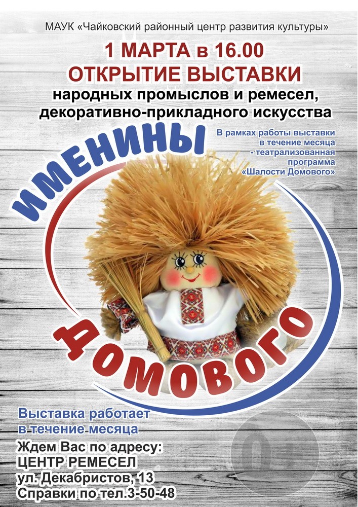 Центр ремёсел МАУК «Чайковский районный центр развития культуры», продолжая начатую деятельность по сохранению и возрождению традиций народных промыслов и ремёсел, проводит конкурс-выставку по созданию художественного образа народной куклы - Домового. Открытие выставки «Именины Домового» запланировано на 1 марта в Центре ремёсел (ул. Декабристов, 13).
