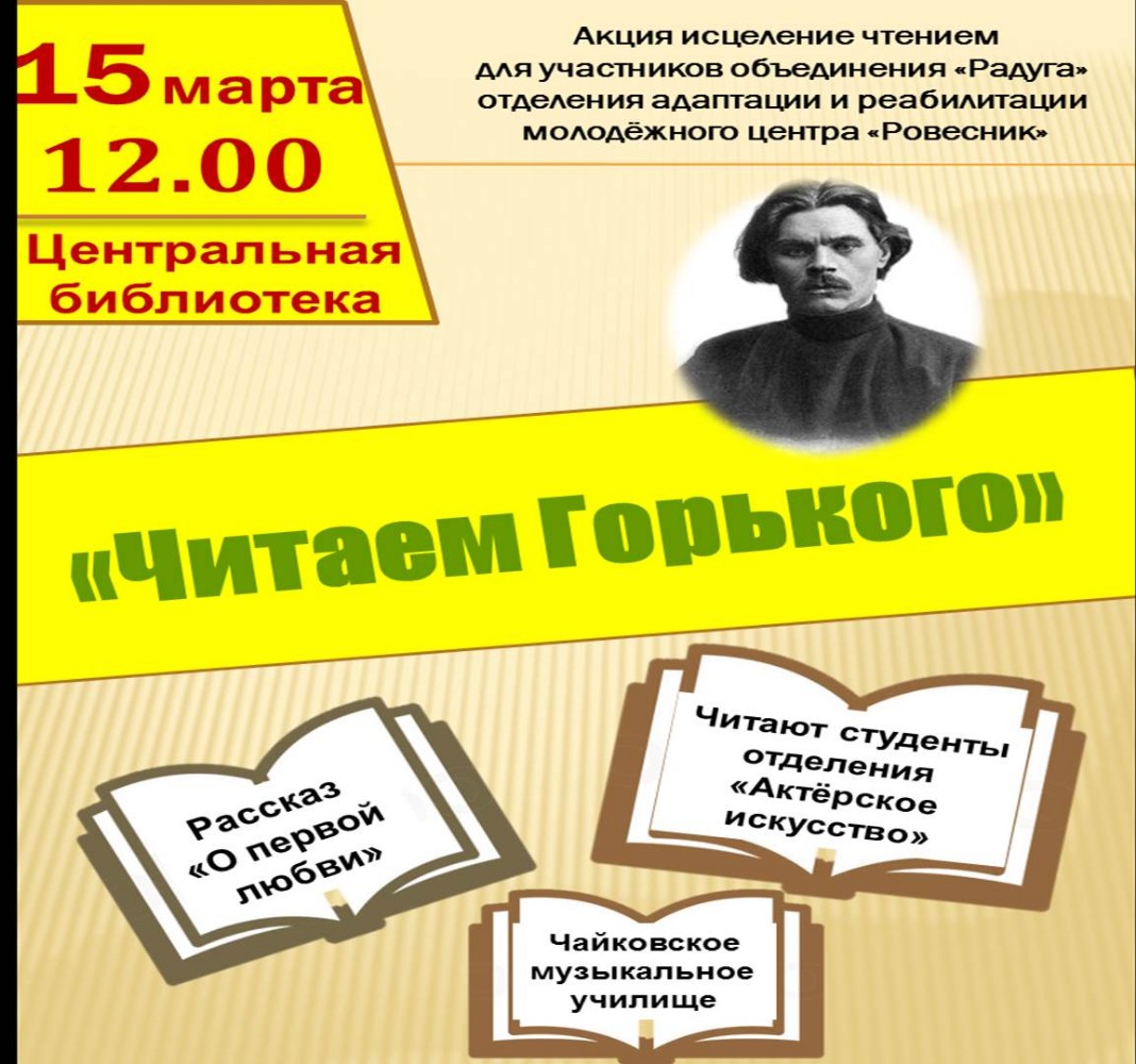 Завтра, 15 марта, в Чайковском в Центральной библиотеки проводится акция исцеление чтением «Читаем Горького», приуроченная к 150-летнему юбилею писателя А. М. Горького для участников объединения «Радуга» отделения адаптации и реабилитации молодёжного центра «Ровесник».