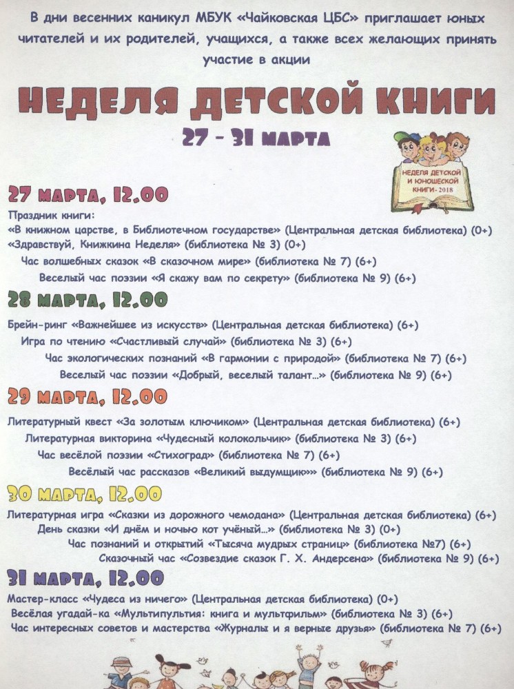 Впереди каникулы. А это значит, что у школьников будет много свободного времени! Чем заняться в выходные? Сходить в библиотеку! Тем более чайковские библиотеки подготовили для школьников множество интересных мероприятий, объединенных акцией «Неделя детской книги».