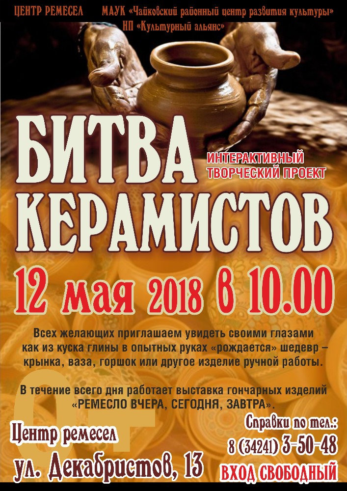 Итоговым знаковым событием для керамистов, прошедших обучающий курс, является участие в интерактивном творческом проекте «Битва керамистов», который состоится 12 мая, в Центре ремесел.