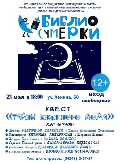Центральная детская библиотека приглашает юных чайковцев в гости. Для школьников в рамках акции «Библиосумерки» будут звучать литературные загадки, пройдут различные игры и конкурсы, а также все желающие смогут пройти квест-игру «Тайны книжного дома».