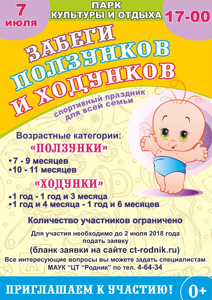Рекомендуем ознакомиться полным положением о забегах ползунков и ходунков на сайте МАУК "Центр творчества "Родник".