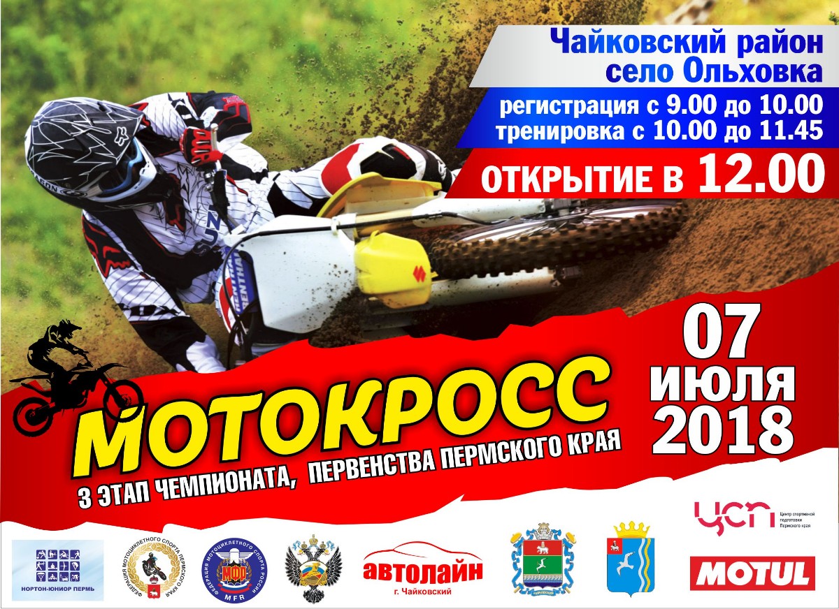 В ближайшую субботу, 7 июля, на мотокроссовой трассе в селе Ольховка Чайковского района (напротив поворота на Соколицу) будет шумно. Здесь пройдёт 3 этапа Чемпионата, первенства Пермского края по мотокроссу.