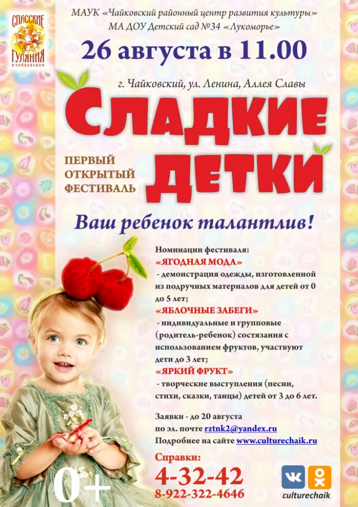 Чайковский районный центр развития культуры приглашает детей и их родителей принять участие в первом фестивале «Сладкие детки».