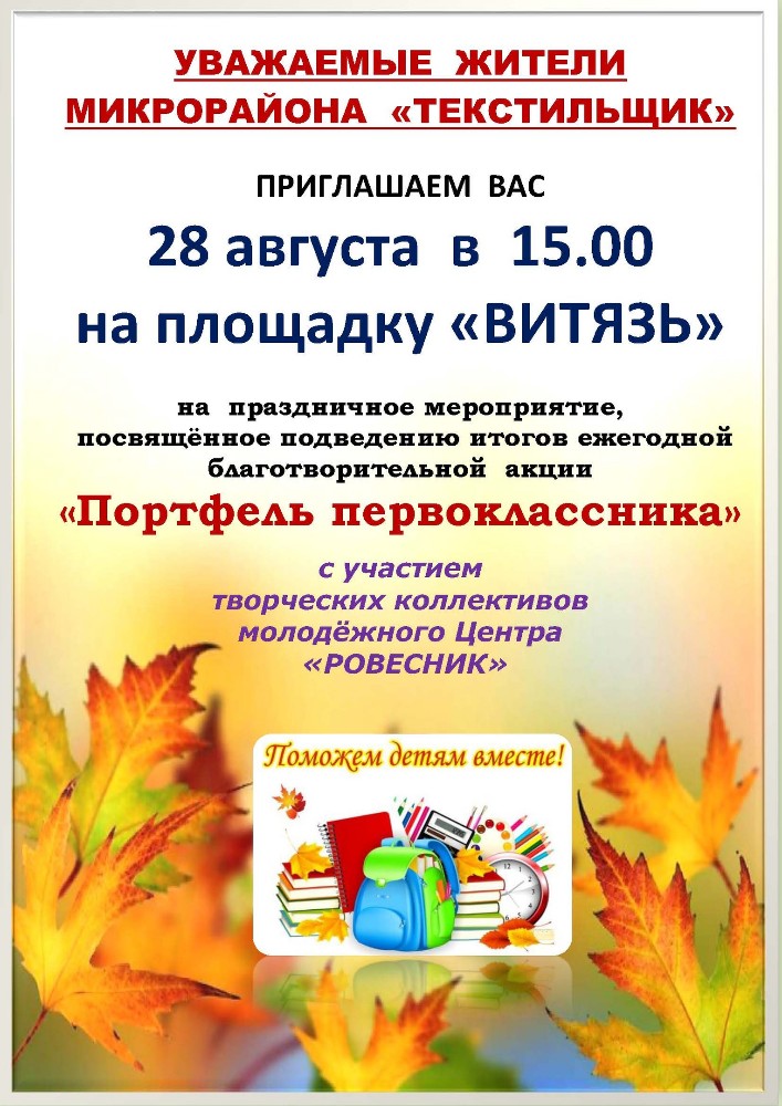 Во вторник, 28 августа, на площадке «Витязь» (вблизи дома по ул. Вокзальная, 65) состоится праздничное мероприятие, посвящённое подведению итогов акции «Портфель первоклассника».