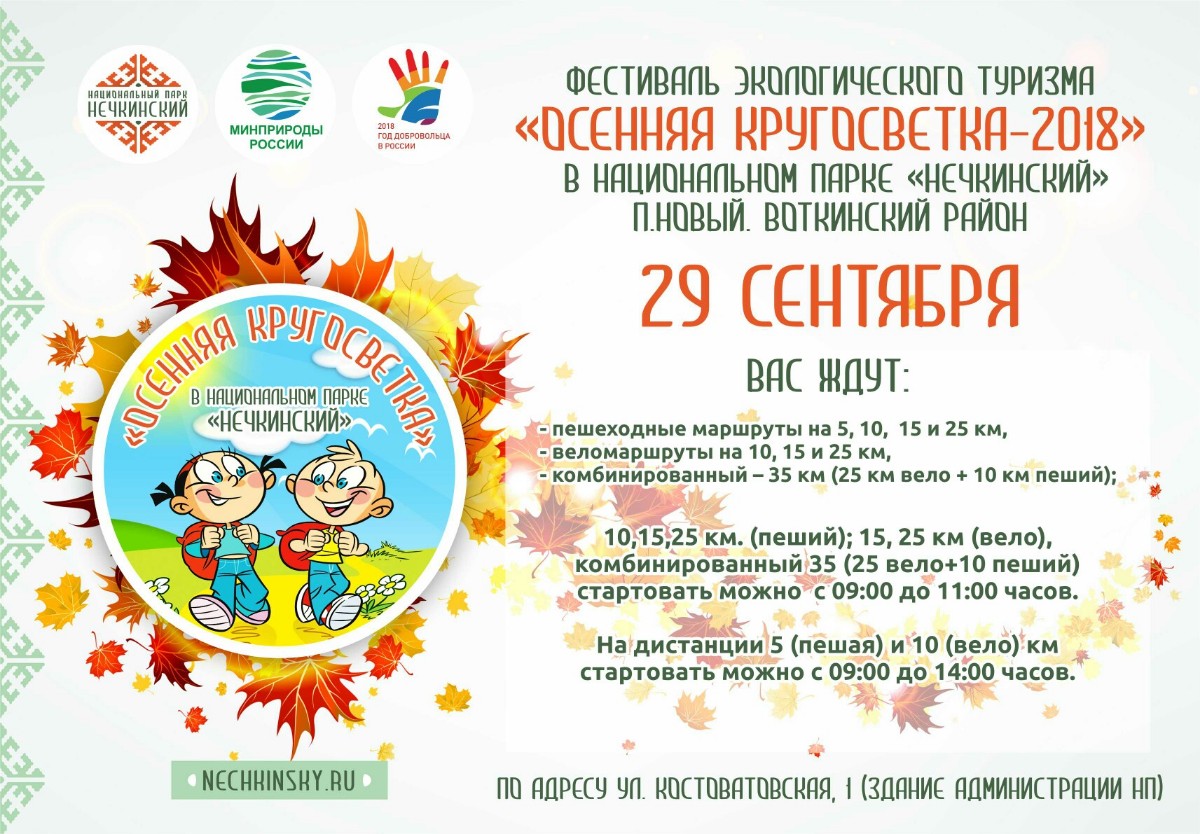 Национальный парк «Нечкинский» вновь приглашает всех жителей посёлка Новый, Чайковского и прилегающих территорий на фестиваль экологического туризма «Осенняя кругосветка». Спортивное мероприятие состоится в субботу, 29 сентября.