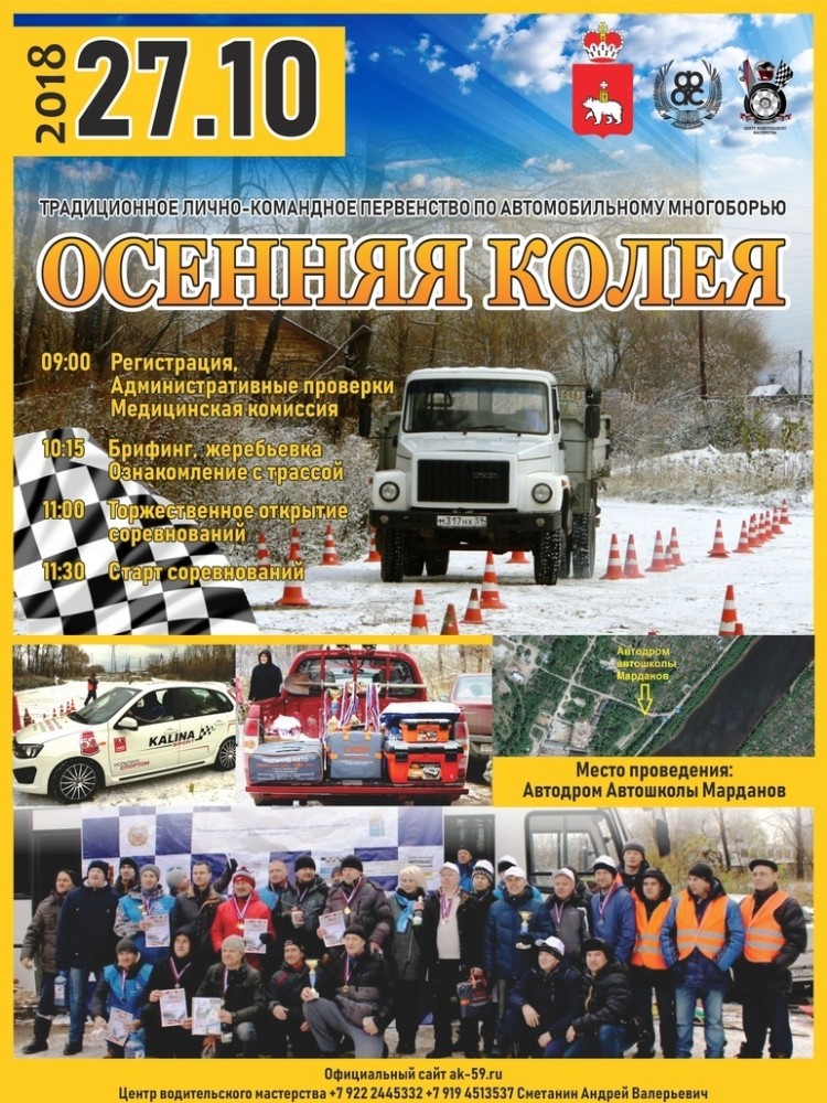 «Осенняя колея» - это традиционная увлекательная командная борьба, сплачивающая коллективы и дающая выплеснуть адреналин на трассе соревнований. Ежегодно соревнования собирают большое количество зрителей и участников. Для участия в соревнованиях заявились десять команд: ПТТиСТ, УАВР-1, Воткинское ЛПУ, Чёрный бумер, МЧС-1, Дарина, Автомех-1, Автомех-2, Автошкола Марданов и СпортКлассика.