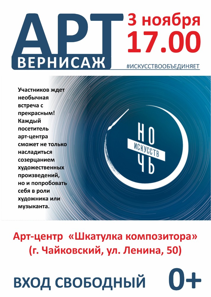 Жителей и гостей города приглашают принять участие во Всероссийской акции «Ночь искусств», которая будет проходить в Чайковской художественной галерее и арт-центре «Шкатулка композитора».