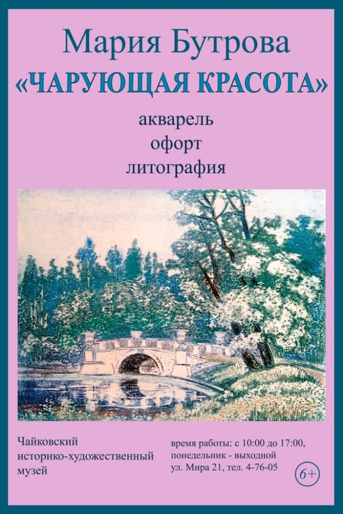 «Чарующая красота» - так называется выставка, открытие которой состоится в Чайковском историко-художественном музее. На выставке будут представлены работы петербургской художницы Марии Бутровой в техниках акварель, офорт, литография. Вход на открытие свободный.