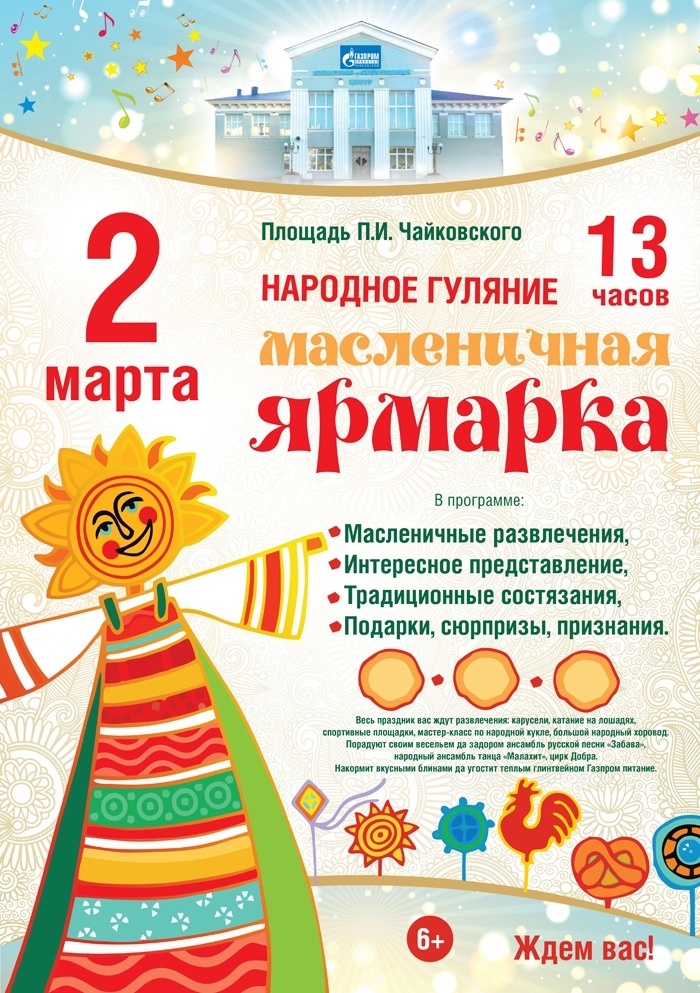 В субботу, 2 марта, на площади Петра Ильича Чайковского пройдёт народное гуляние «Масленичная ярмарка».