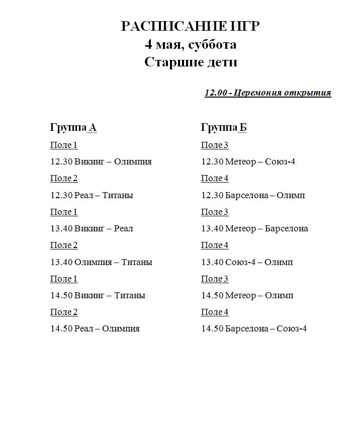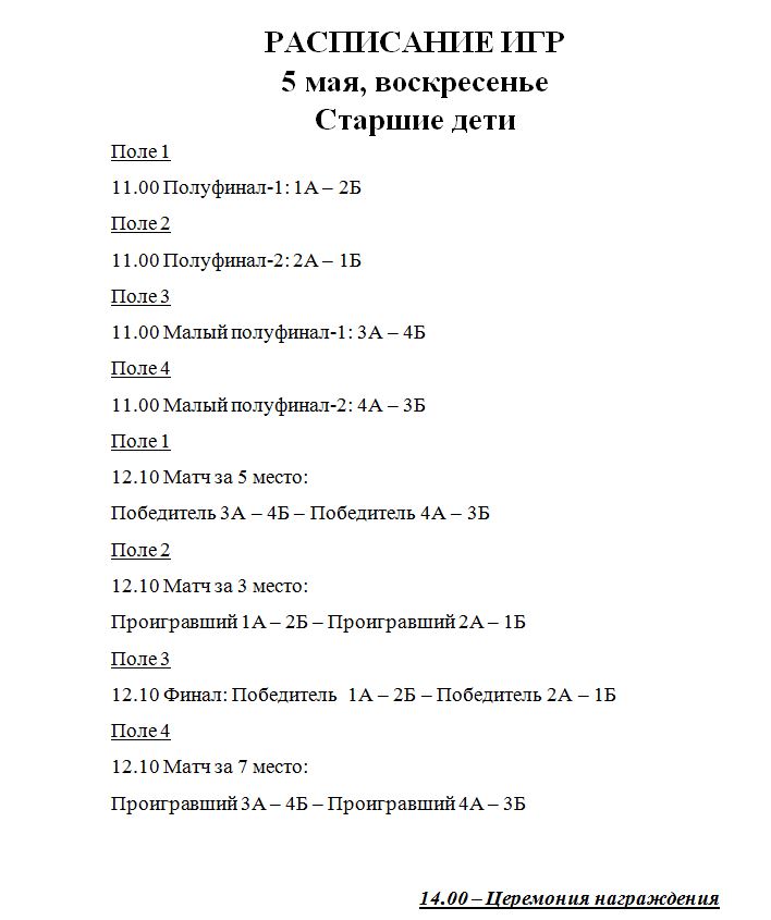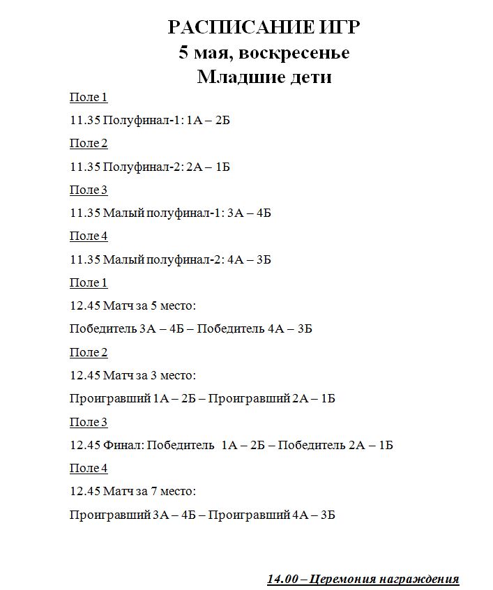 В субботу, 4 мая, в полдень пройдёт церемония открытия спортивного фестиваля, а уже затем юные футболисты начнут игру. На следующий день футбольные баталии стартуют с 11.00, а в 14.00 запланирована церемония награждения.