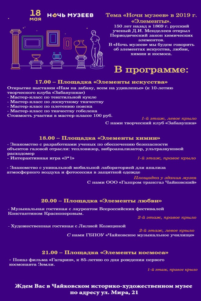 «Элементы – это экспонаты и люди, создающие, организующие и посещающие музейное пространство. В «Ночь музеев» мы будем говорить об элементах искусства, любви, химии и космоса», – отметили в музее.