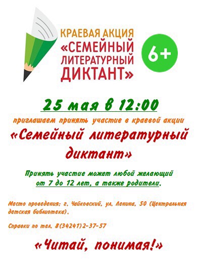 В субботу, 25 мая, в Чайковской центральной детской библиотеке (ул. Ленина, 50) пройдёт краевая акция «Семейный литературный диктант». Девиз Диктанта – «Читай, понимая!»