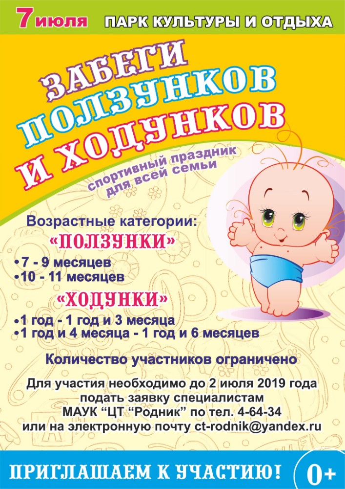 Заявки на участие в забегах ходунков и ползунков принимаются до 2 июля по телефону по телефону 4-64-34 (Максимова Дарья Александровна, Морозова Юлия Александровна) либо на адрес электронной почты ct-rodnik@yandex.ru (с пометкой «Забеги ползунков» или «Забеги ходунков»)