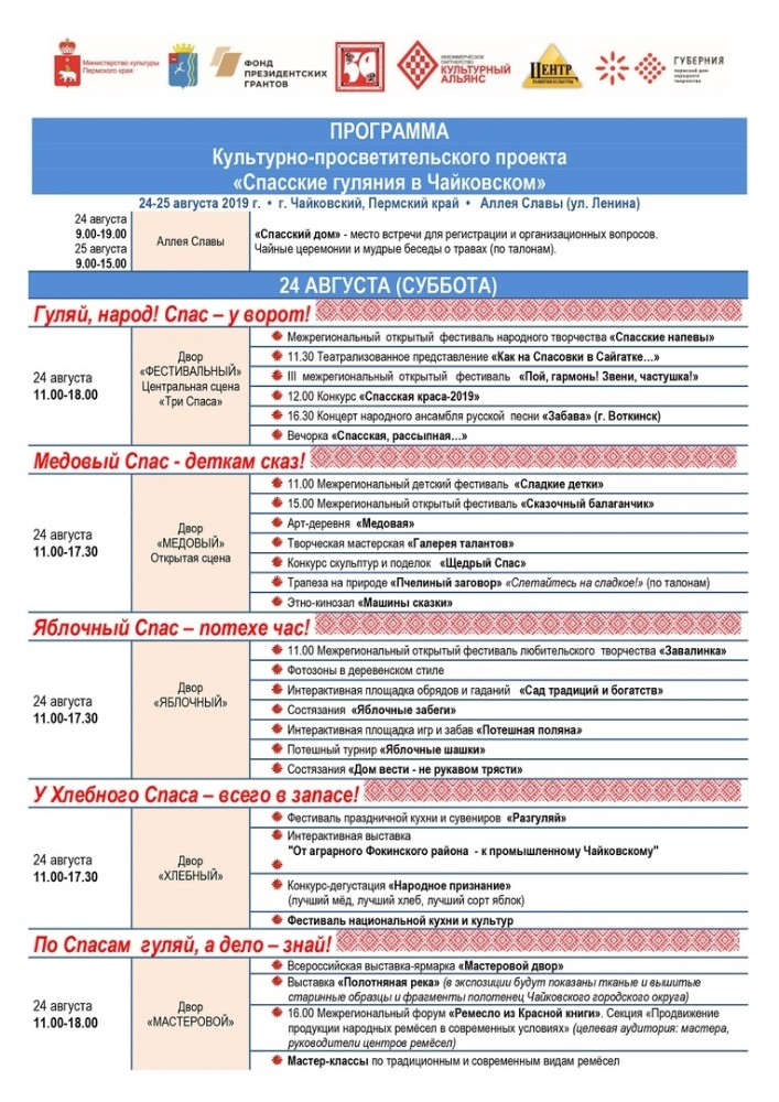 В течение двух дней на Аллее Славы пройдут: фестиваль детского творчества «Сладкие детки», фестиваль «Пой, гармонь! Звени, частушка!», фестиваль творчества «Спасские напевы», фестиваль «Сказочный балаганчик», фестиваль любительского творчества «Завалинка», фестиваль праздничной кухни и сувениров «Разгуляй», выставка-ярмарка «Мастеровой двор».
