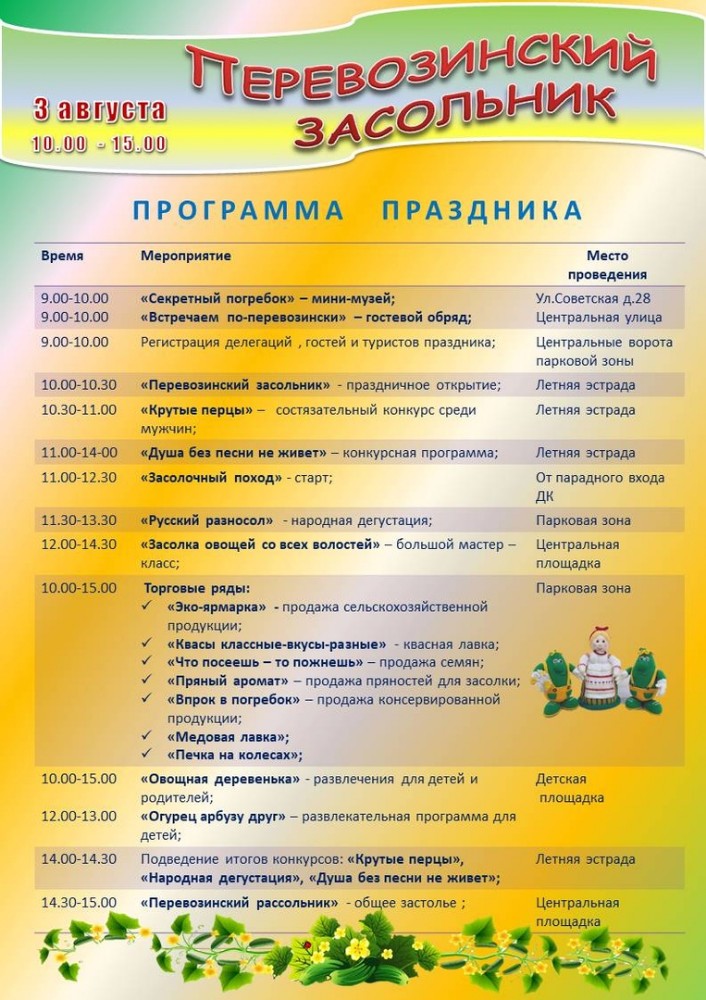 Все желающие смогут поучаствовать в увлекательных мастер-классах и конкурсах: посетить «Огурпарк» с развлечениями, большой базар с разносолами, поучаствовать в засолочном походе в личные подворья жителей села с полным циклом от сбора до засолки огурцов, узнать рецепты и советы по засолочному мастерству, принять участие в народной дегустации «Русский разносол».