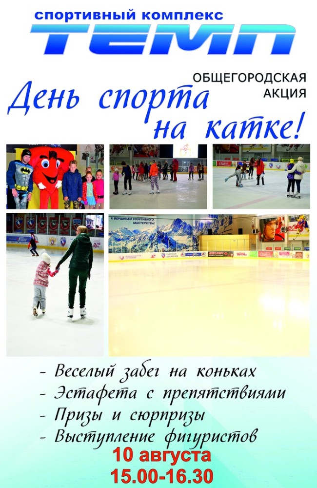 Спортивный праздник состоится в субботу, 10 августа, с 15.00 до 16.30. Каток будет работать бесплатно, однако прокат коньков оплачивается по тарифам катка в кассе, уточнили в СК «Темп».