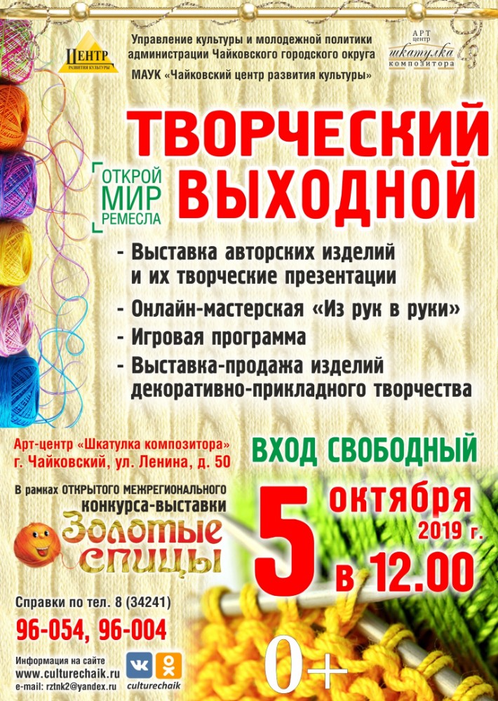 Чайковский центр развития культуры приглашает к участию в межрегиональном конкурсе-выставки «Золотые спицы». В творческом состязании могут принять участие: Центры ремёсел, художники, мастера, рукодельницы, студии, клубы, коллективы, работающие в жанре рукотворных изделий, физические лица, независимо от возраста и наличия художественного образования.