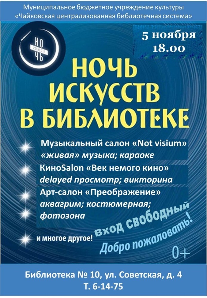 Кроме того, интересные мероприятии в рамках «Ночи искусств» пройдут в библиотеке № 10 (ул. Советская, 4) во вторник, 5 ноября.