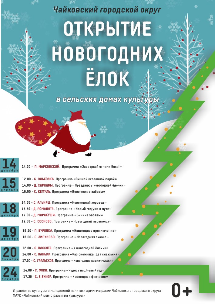 Кроме того, Центр развития культуры опубликовал график открытия новогодних ёлок в сельских территориях Чайковского городского округа. Праздничные открытия пройдут с 14 по 24 декабря.