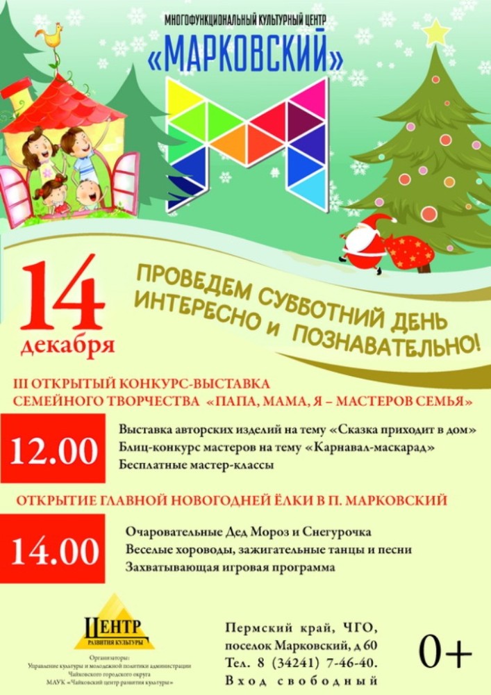 Откроет череду праздничных мероприятий открытие ёлочки в посёлке Марковский, 14 декабря. В полдень все желающие смогут посетить ярмарку готовых рукотворных изделий и понаблюдать за процессом создания новых шедевров на III открытом конкурсе – выставке семейного творчества «Папа, мама, я – мастеров семья».
