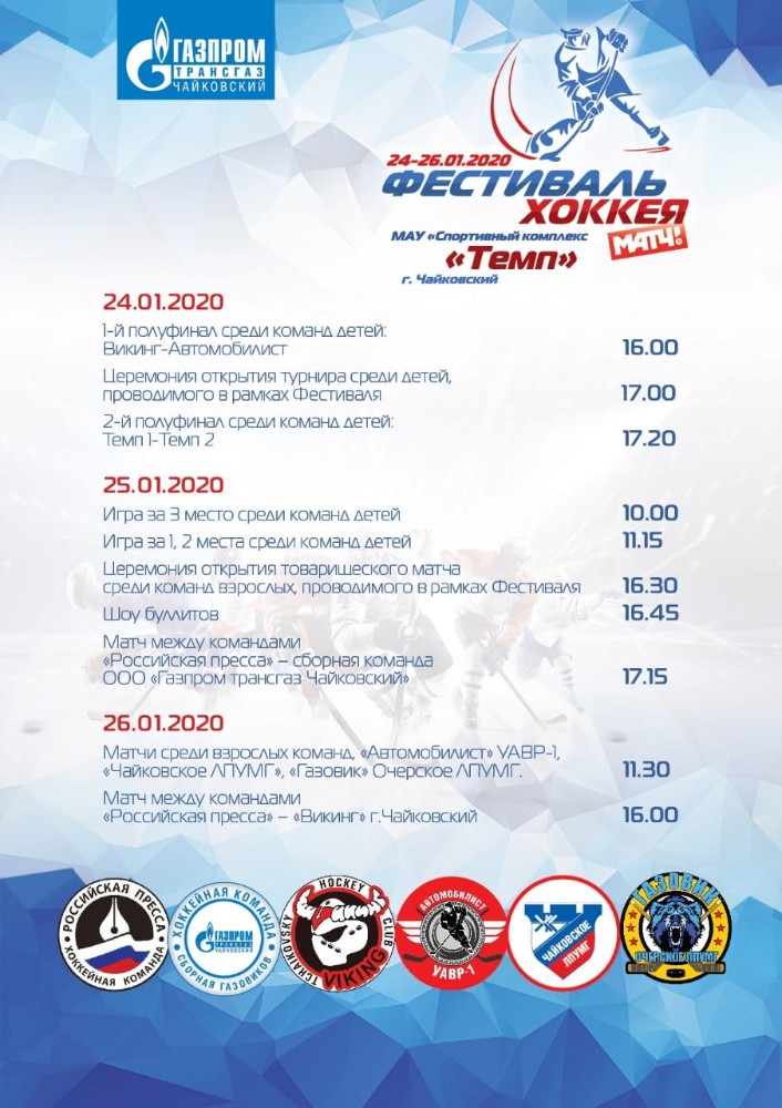25 января в ледовом дворце «Темп» состоится игра между командами «Российская пресса» и ООО «Газпром трансгаз Чайковский», а 26 января «Российская пресса» сыграет с городской ледовой дружиной «Викинг».