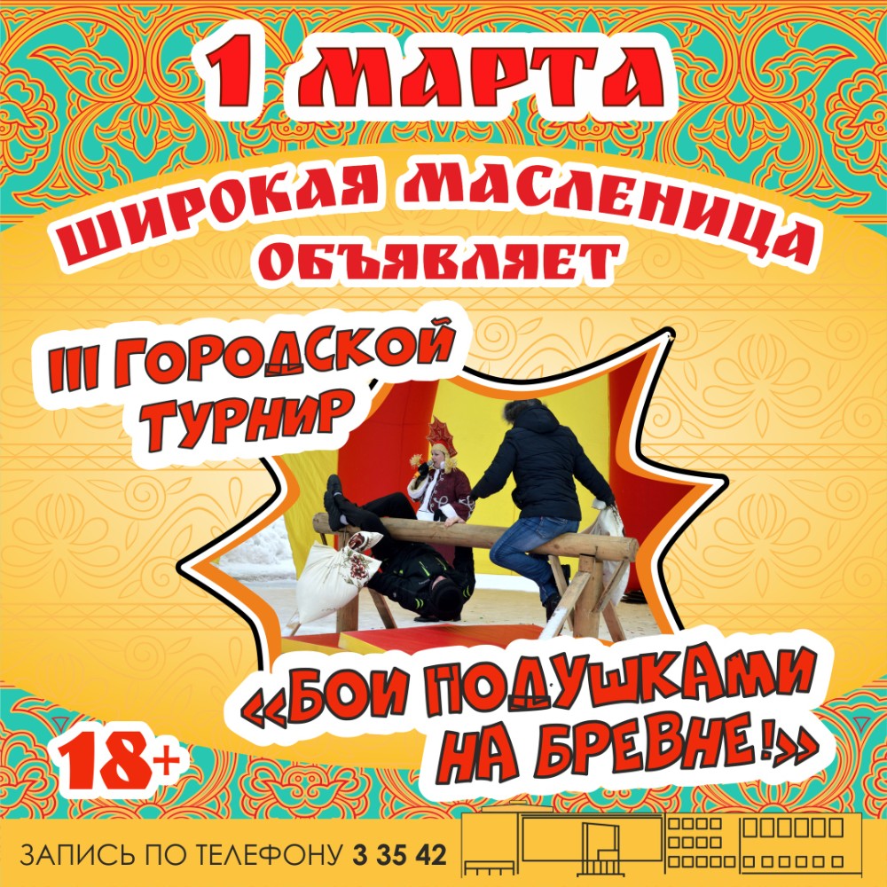Турнир «Бои подушками на бревне» - мероприятие традиционное, полюбившееся горожанам, которое проводится в рамках народного гуляния «Широкая масленица». В этом году состязания пройдут в воскресенье, 1 марта. Точное время, место проведения турнира и полная программа мероприятия будет объявлено позже.