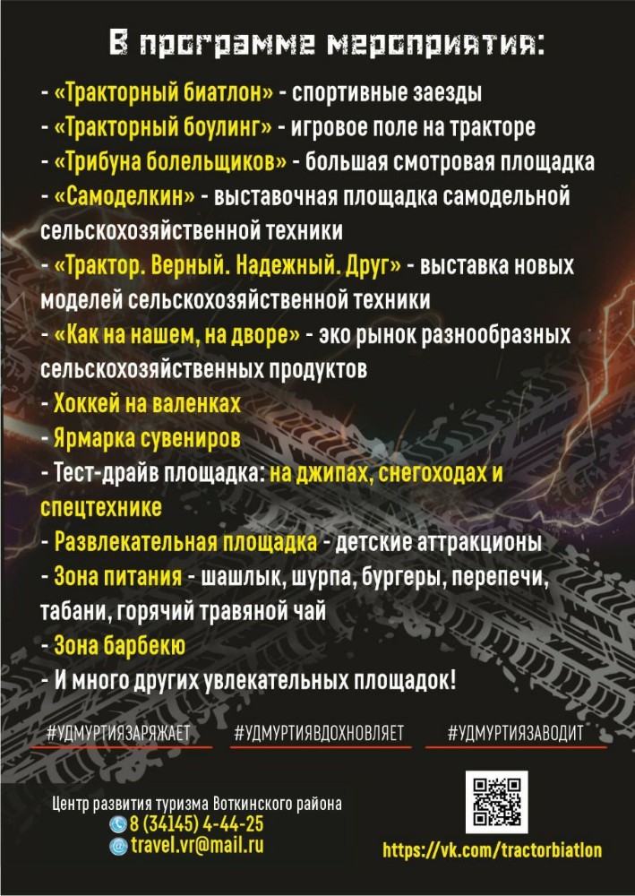 Напомним, впервые соревнования по тракторному биатлону прошли в деревне Большая Кивара Воткинского района в 2018 году и были организованы по инициативе самих жителей. Уже в 2019 году состязания получили статус международных открытых игр, а проект «Тракторный биатлон» вошёл в календарь событийного туризма Удмуртии.