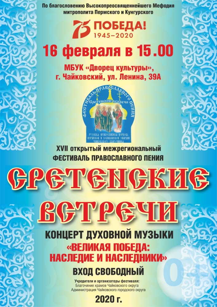 По благословению Высокопреосвященнейшего Мефодия митрополита Пермского и Кунгурского в дни празднования Русской Православной Церковью – праздника Сретенья Господня будет проводиться семнадцатый фестиваль православного пения «Сретенские встречи».