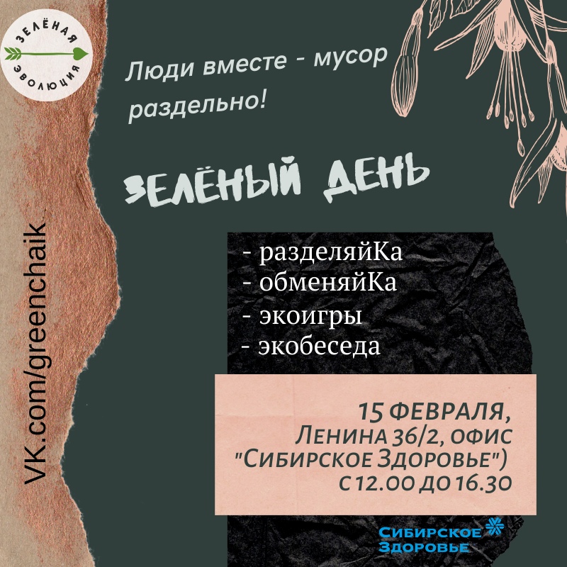 Экологическое мероприятие «Зелёный день» пройдёт в субботу, 15 февраля, с 12.00 до 16.30 в офисе компании «Сибирское здоровье» (ул. Ленина, 36/2).