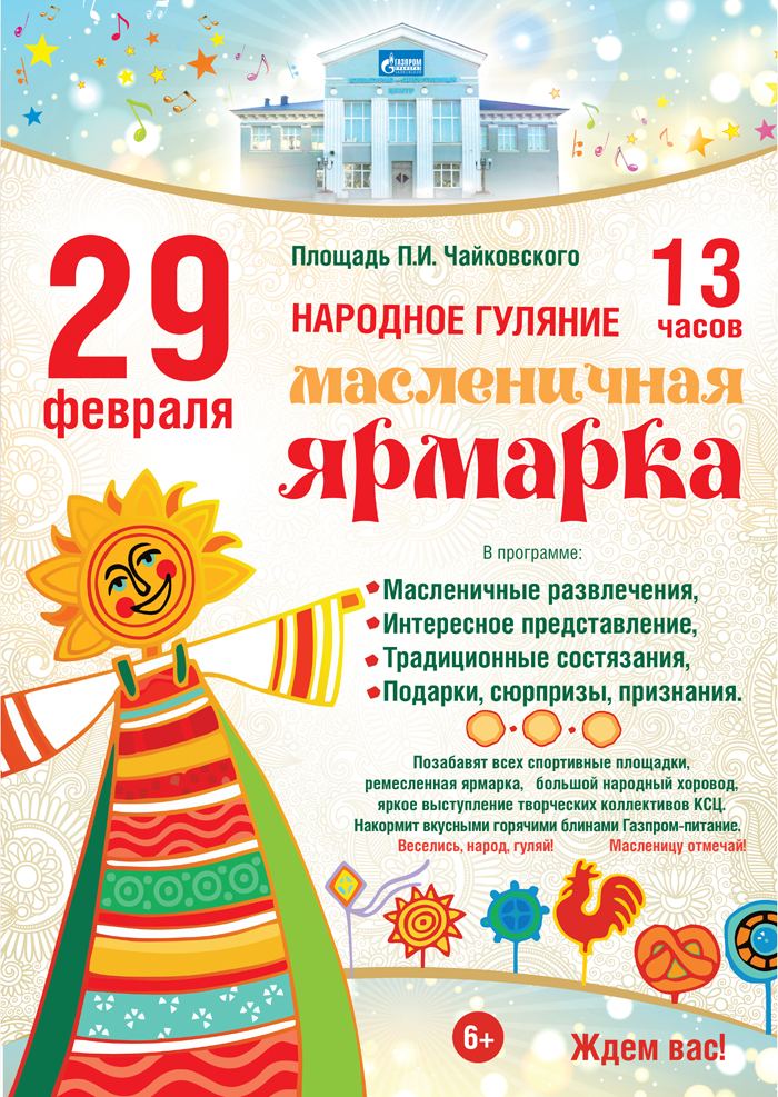 В субботу, 29 февраля, на площади Петра Ильича Чайковского пройдёт народное гуляние «Масленичная ярмарка». Гостей праздника позабавят спортивные площадки, удивит ремесленная ярмарка, мастер-класс, большой народный хоровод, яркое выступление творческих коллективов Культурно-спортивного центра, накормит вкусными горячими блинами.