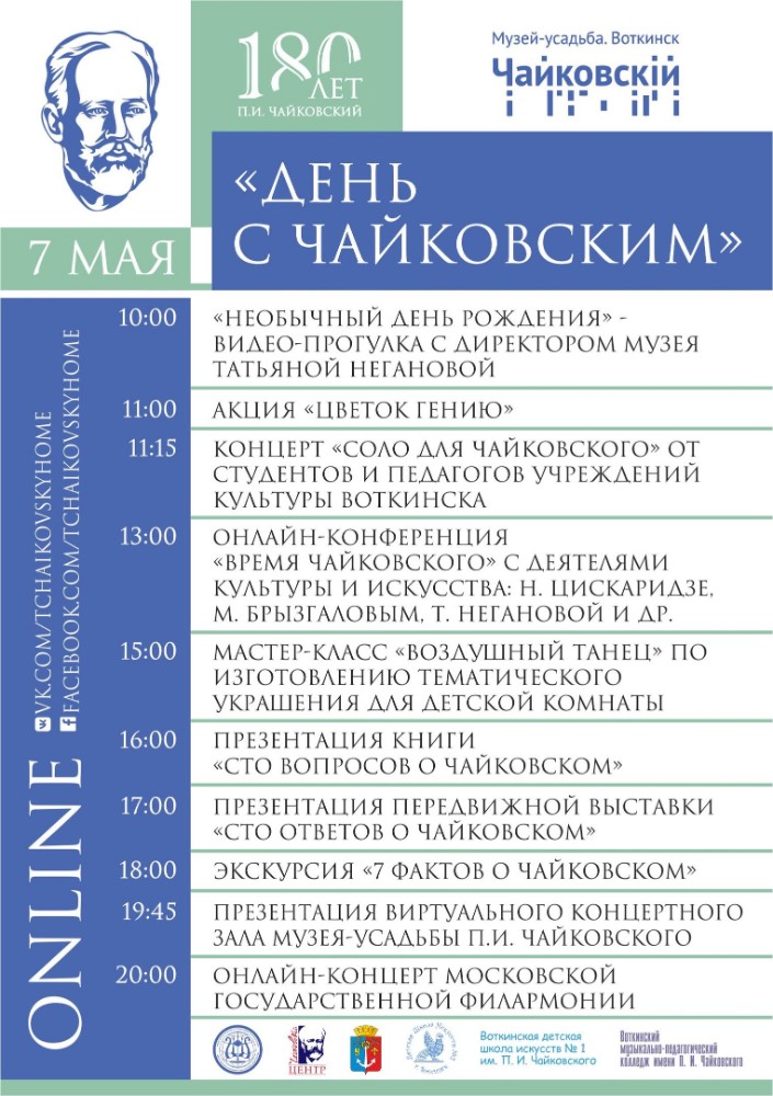 Мероприятия начнутся с онлайн-прогулки, которая перейдёт в возложение цветов к памятнику композитора на берегу Воткинского пруда. Также в этот день пройдёт онлайн-концерт, на котором преподаватели и студенты учебных заведений Воткинска исполнят любимые произведения Петра Чайковского в пустом зале. Затем для юных зрителей проведут мастер-класс «Воздушный танец», на котором дети смогут смастерить балерин. Кроме того, сотрудники музея презентуют выставку «100 ответов о Чайковском». Посетители смогут получить ответы на интересующиеся вопросы о композиторе, решив ребусы и задачки.