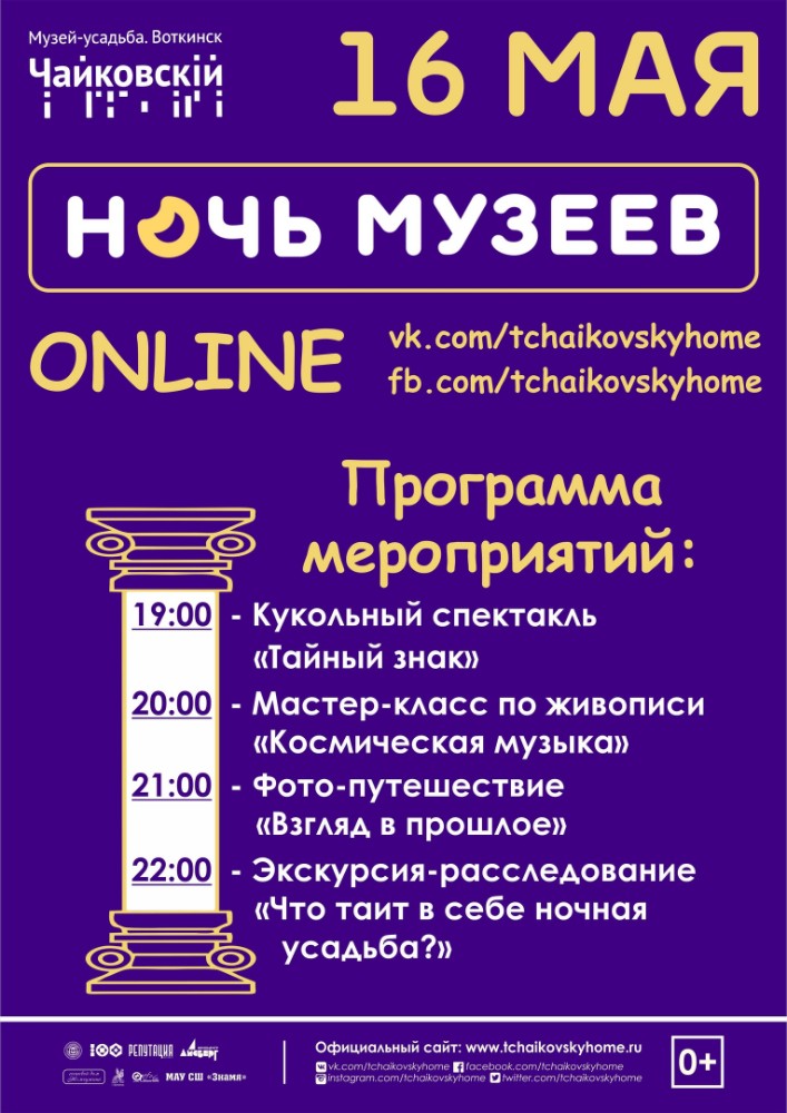 Чайковский историко-художественный музей и музей-усадьба П.И. Чайковского в Воткинске представили программу мероприятий в рамках Всероссийской акции «Ночь музеев», которая в этом году впервые состоится режиме онлайн. Жителей Чайковского округа приглашают присоединиться к акции!