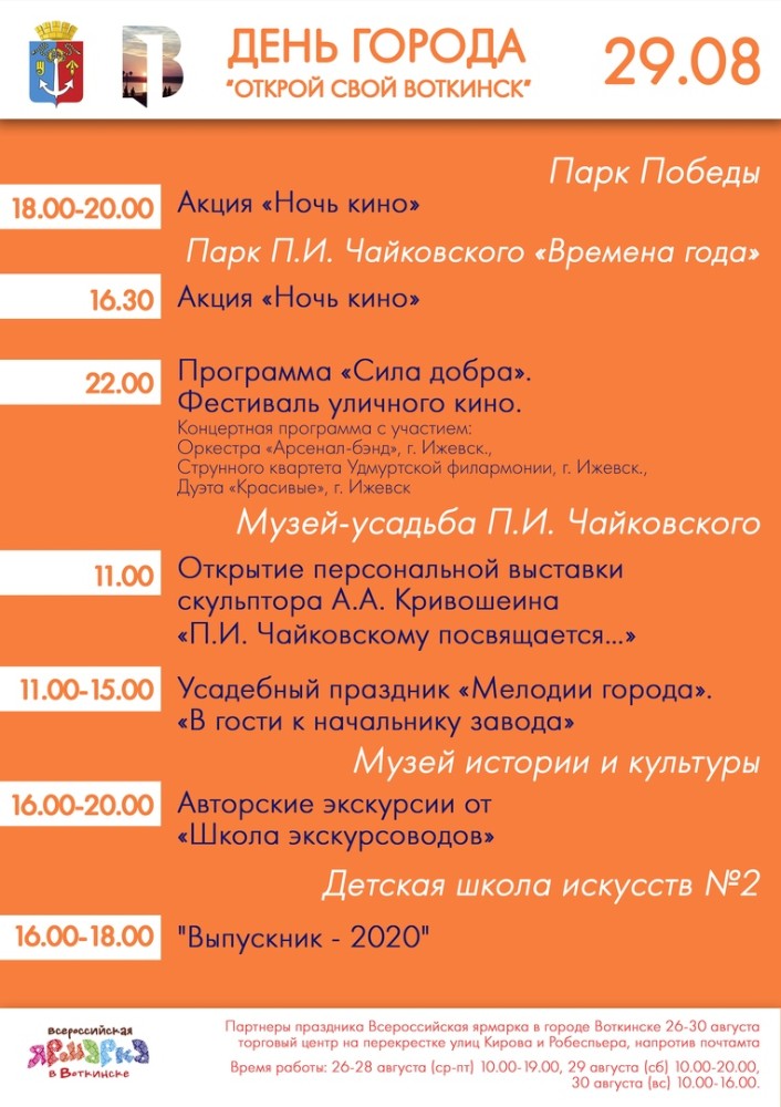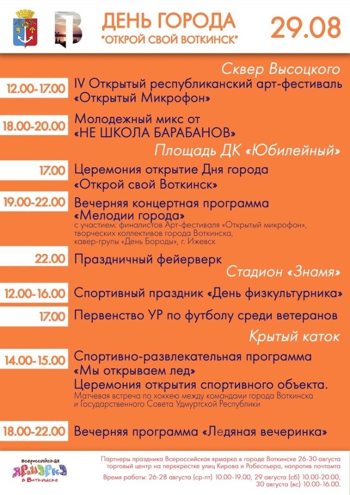 17:00 -18:00 - торжественное открытие Дня города «Открой свой Воткинск!». Выступления творческих коллективов ДК «Юбилейный»;