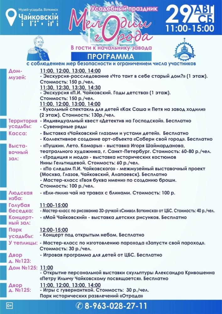 11:00 - 15:00 - Усадебный праздник "Мелодии города: в гости к начальнику завода", 0+. Программа праздника: