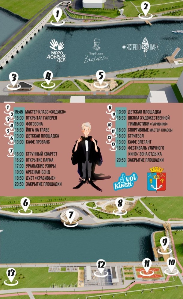 18:00 -19:00 — презентация реализованных проектов по благоустройству Воткинска и стратегии развития на 2020-2030 годы на большом экране;