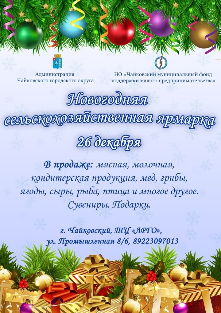 Жители и гости Чайковского городского округа могут позаботиться и купить всё для вкусного новогоднего стола в одном месте - на праздничной сельхозярмарке. Она пройдёт в субботу, 26 декабря, в ТЦ «Арго» (ул. Промышленная, 8/6).