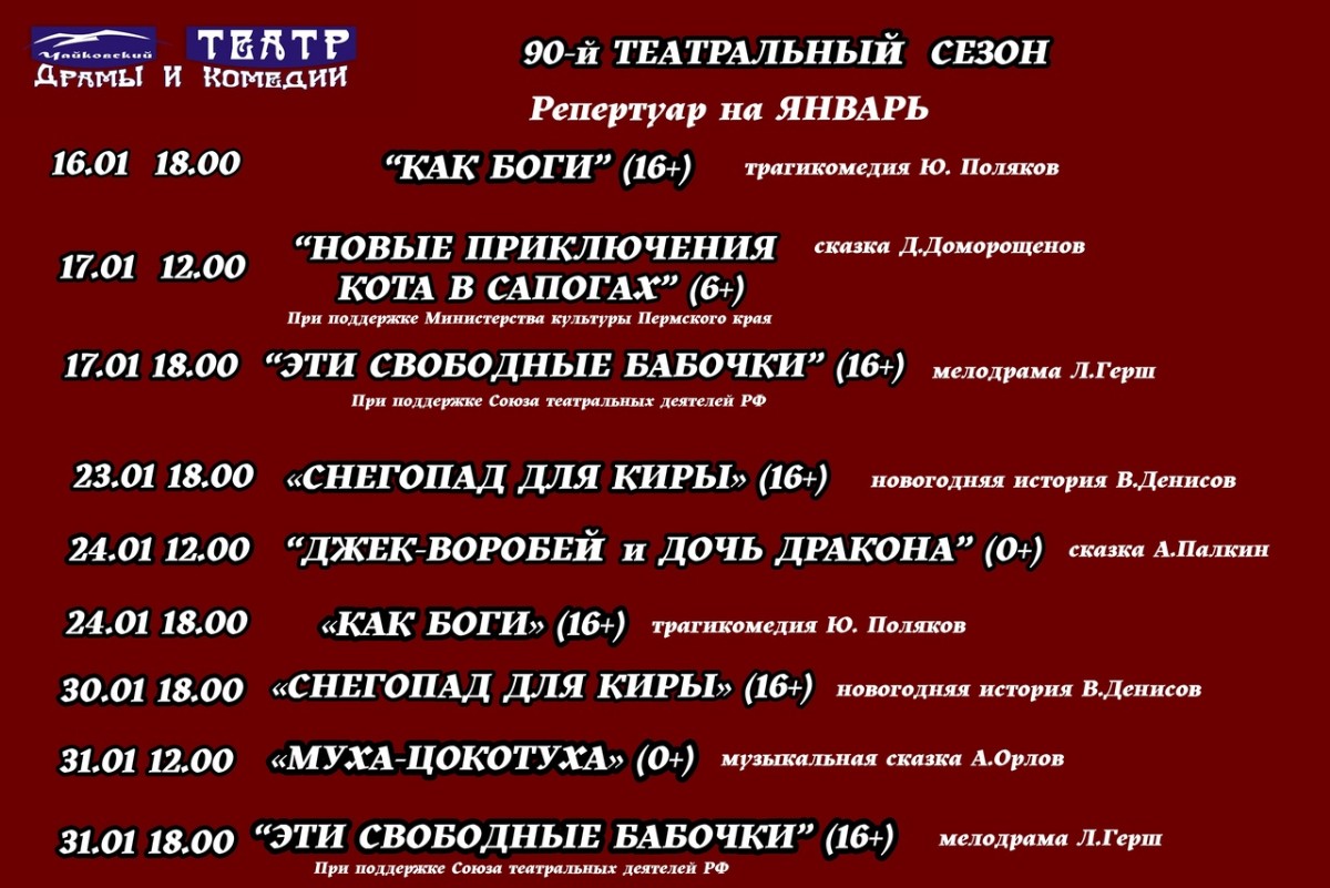 Чайковский театр драмы и комедии предоставил своим зрителям репертуар на январь 2021 года.