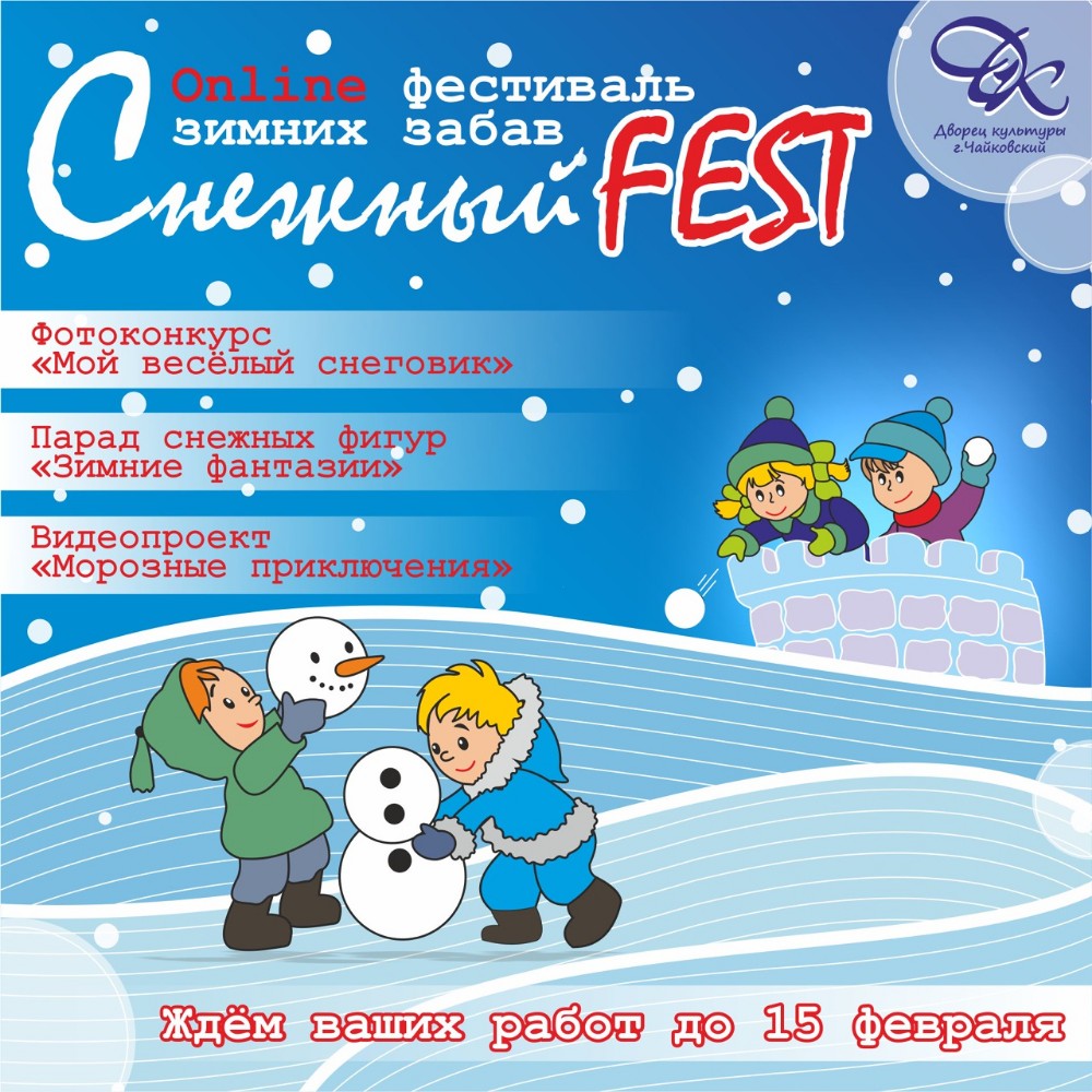 Дворец культуры объявил о старте онлайн-фестиваля зимних забав «Снежный Fest». В рамках фестиваля проводится парад снежных фигур «Зимние фантазии», фотоконкурс «Мой весёлый снеговик» и видеоконкурс «Морозные приключения».