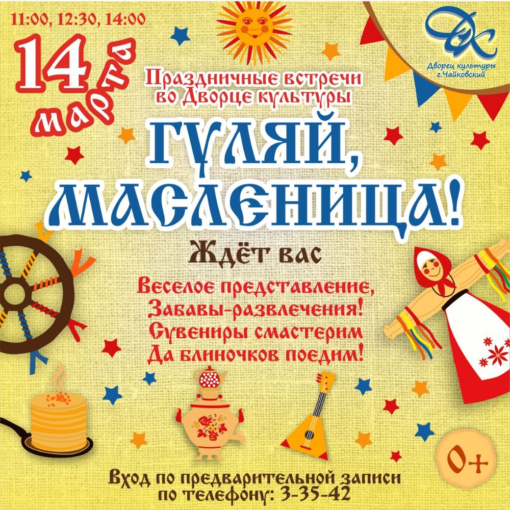 В воскресенье, 14 марта, в 11:00, 12:30 и 15:00 для жителей города Чайковский во Дворце культуры состоятся праздничные встречи «Гуляй, Масленица!».
