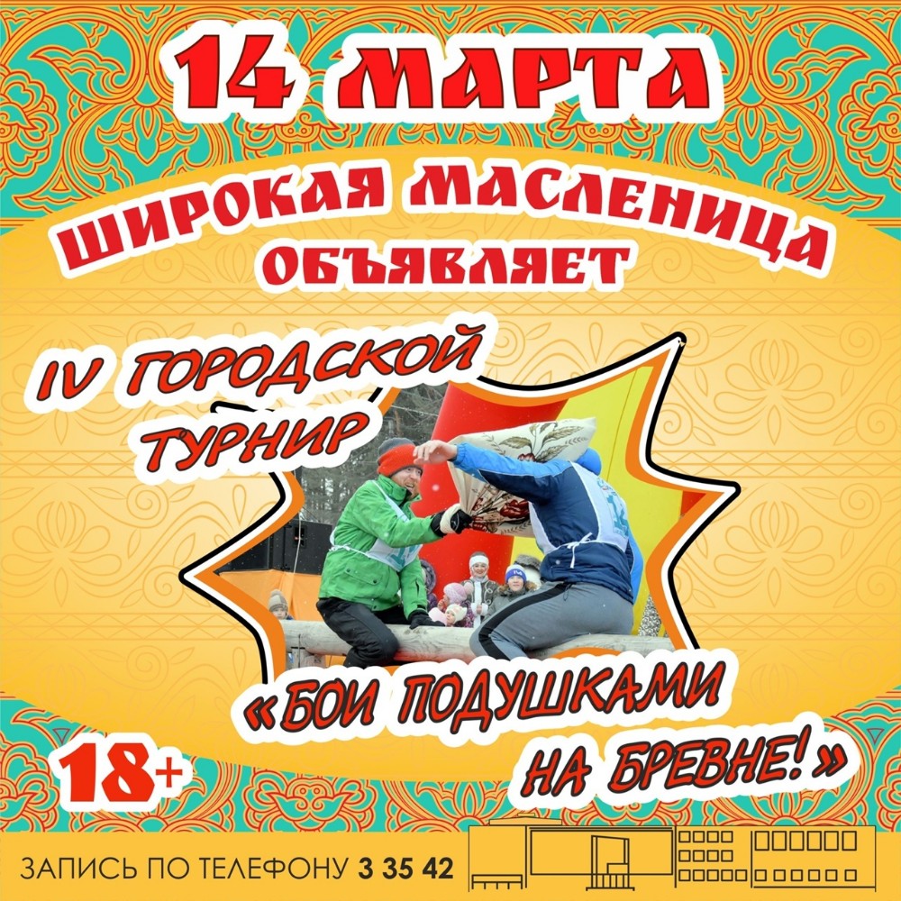 Кроме того, в рамках праздничных встреч «Гуляй, Масленица!» состоится традиционный городской турнир «Бои подушками на бревне», где вы сможете попробовать свои силы в народном потешном состязании.