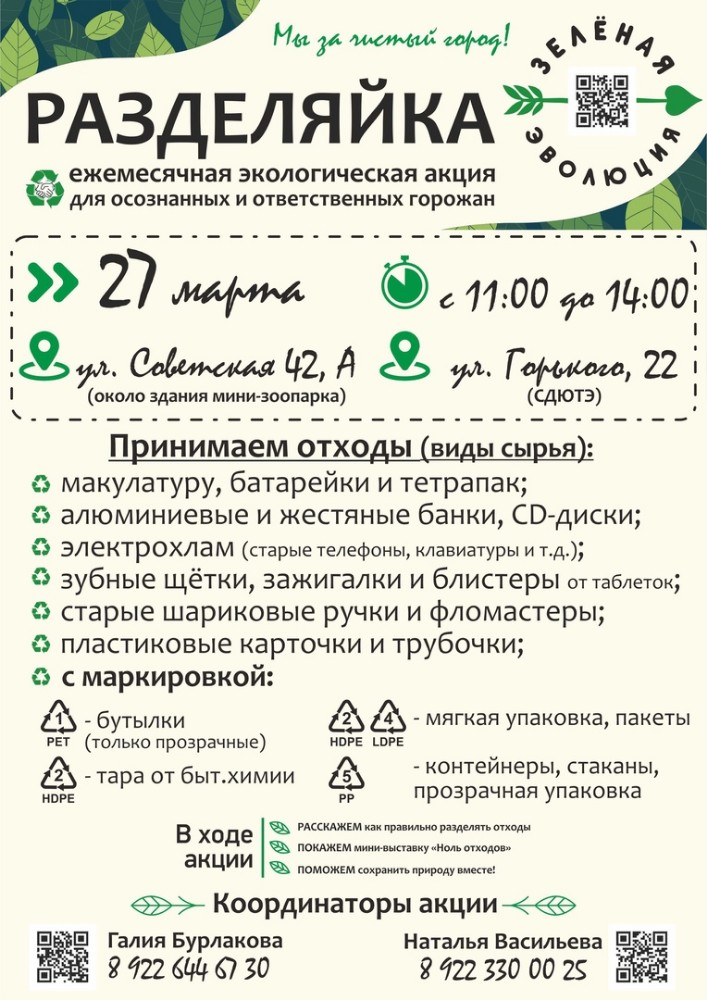 Уже ставшая традиционной экологическая акция «Разделяйка» пройдёт в ближайшую субботу, 27 марта. Место встречи неравнодушных к экологии и будущему нашей Земли - ул. Советская, 42А (около здания мини-зоопарка) и ул. Горького, 22 (СДЮТЭ).