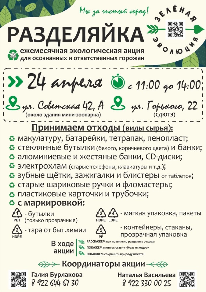 Уже ставшая традиционной экологическая акция «Разделяйка» пройдёт в ближайшую субботу, 24 апреля. Место встречи неравнодушных к экологии и будущему нашей Земли - ул. Советская, 42А (около здания мини-зоопарка) и ул. Горького, 22 (СДЮТЭ).