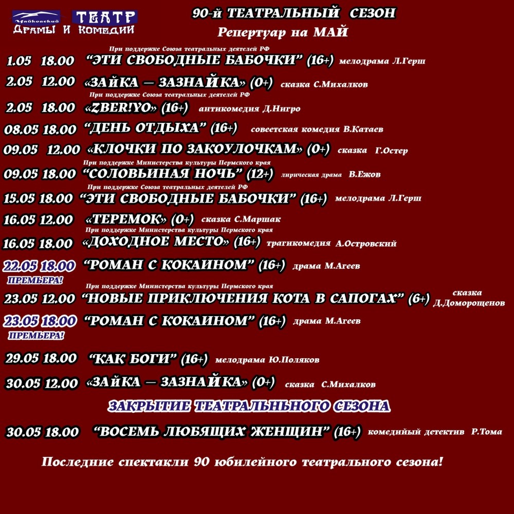 В предстоящем мае Чайковский театр драмы и комедии завершит свой юбилейный 90-й театральный сезон. Любителей театра ждут как и полюбившиеся постановки, так и премьера!