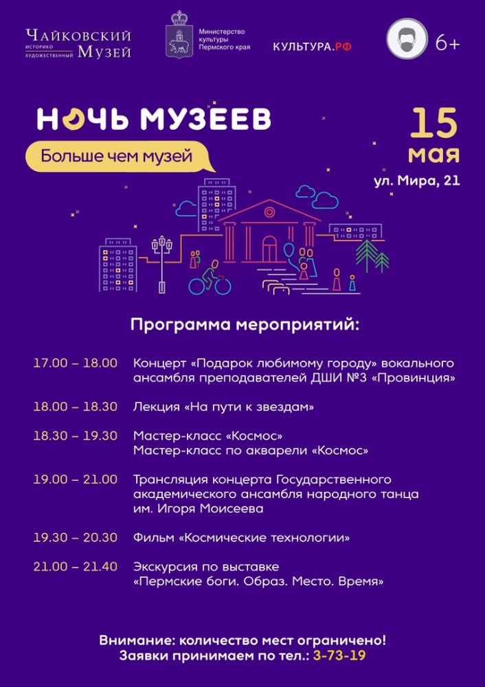 Начало акции запланировано на 17.00 с концерта «Подарок любимому городу» вокального ансамбля преподавателей ДШИ №3 «Провинция», далее начнётся лекция «На пути к звездам». Продолжится программа мастер-классом росписи по акварели «Космос». В 19.00 заявлена трансляция концерта Государственного академического ансамбля народного танца им. Игоря Моисеева. В 19.30 чайковцы приглашены на показ фильма «Космические технологии». Завершится программа экскурсией по выставке «Пермские боги. Образ. Место. Время».