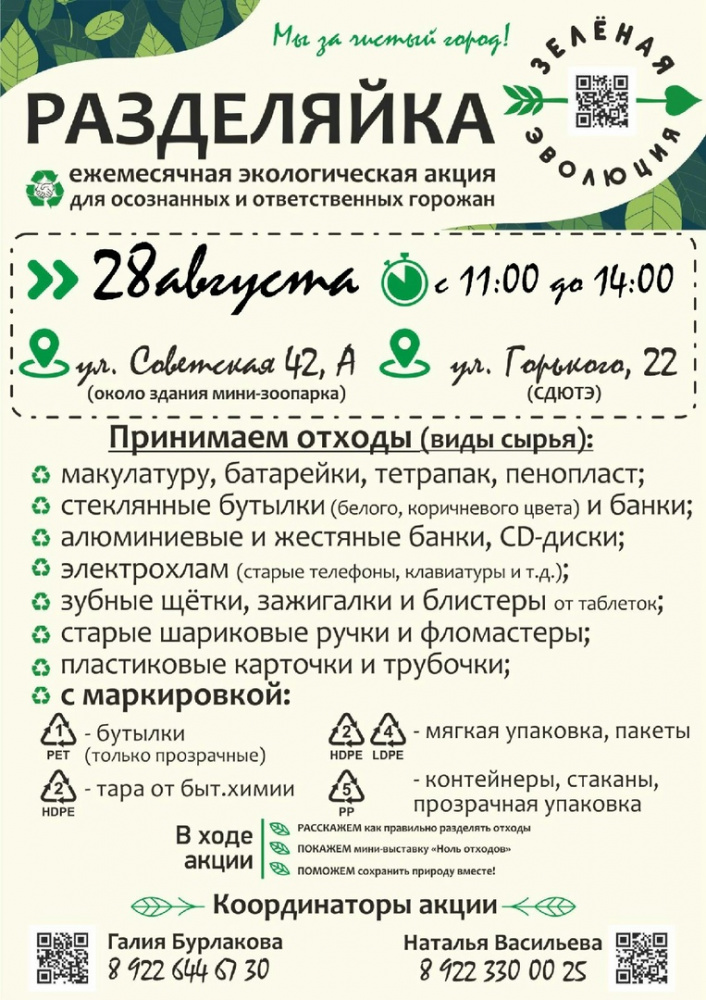 Чайковцев приглашают сдать макулатуру, отработанные батарейки, старые шариковые ручки и фломастеры, тетрапак, пенопласт, электрохлам (старые телефоны, клавиатуру и др.), алюминиевые и жестяные банки, блистеры от таблеток, зубные щетки, пластиковые трубочки 28 августа. Отходы будут приниматься с 11.00 до 14.00 в двух точках нашего города: около здания мини-зоопарка на ул. Советской, 42А и в здании СДЮТЭ на ул. Горького, 22.