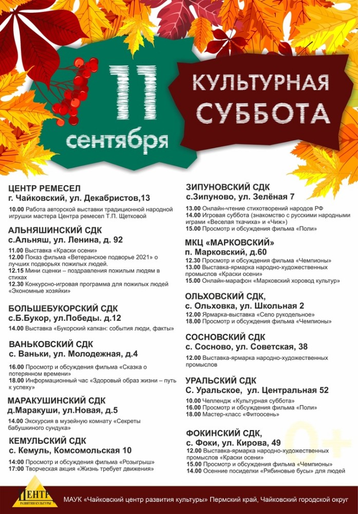 Чайковский центр развития культуры приглашает жителей округа принять участие во Всероссийской акции «Культурная суббота», которая состоится 11 сентября.